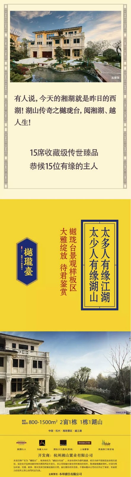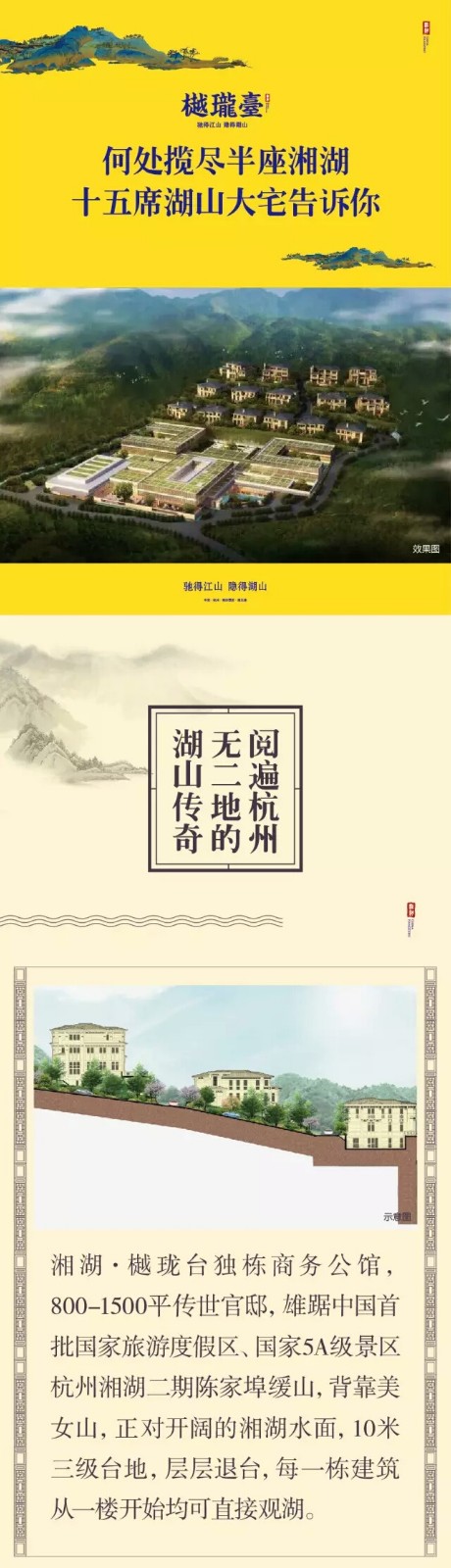 樾珑台(本项目推广名为“樾珑台”,核准地名为“樾珑台名座”)项目位于杭州市萧山区湘湖二期陈家埠休闲旅游度假区,处于国家4A级湘湖旅游度假区的核心区域,背靠美女山,正面即为开阔的湘湖水面,10-12米三级台地,层层退台,每一栋建筑从一楼开始均可直接观湖。 产品类型定位为度假酒店及低层低密度商务办公楼。项目规划由一座度假酒店(约16000平米)和十五幢独立式低层精品商务公馆(建筑面积平均为1000平米/幢左右)组成。 商务公馆整体建筑风格为合璧中西的家族大宅,整体设计萃取欧式风格,西方宫廷建筑中的威严礼仪,如厚重的石材、高台阶、粗廊柱等艺术元素表现畅淋,同时在建筑细节上,融合中国古典建筑元素,通过流畅的宽屋檐、奢华的钢钉红门、东方线条的窗饰、斗拱等,体现世家的贵胄风范。 其中商务公馆建筑面积在880—1500平方米之间,首层4.2-4.5米层高、二三层3.5米层高,以极度震撼的空间尺度,形成了磅礴空间感;办公、活动、居住、作业区等均采用全套房设计,构成豪宅内部的丰富内涵,使得诸多空间意向有了实现的可能,可缔造私人博物馆、行政官邸、家族世居、私人俱乐部等场所。 一层与地下层可以为办公、会议与活动组织空间,二层(含部份三层)可以是居住及私人生活空间,礼仪区、公共区、私密区、工作区等功能区之间互不串扰,适宜于组织董事会会议、总裁办公会议。入口、庭院、台阶、门厅、玄关等通过动线的处理,形成了尊严与礼序。 大面积私家泳池的配置,联合各种按摩和恒温设备、SPA水疗,使得主人可在极度私密的环境里游泳运动、放松身心;户户电梯的预留,使交通更具便利性,同时重要宾客也无需暴露在外,可直接从车库经电梯进入正厅,更显私密与尊贵。 几乎每栋商务公馆四周都被庭院环绕,营造出庭院深深的大宅意向:下沉式庭院含而不露,宁静内敛;前庭院成为入户的一道风景,层次丰富;相对私密的侧院与后院则更为关注主人细腻的生活需求,为其提供更多户外休闲娱乐活动的可能性。 项目酒店为杭州阿玛瑞湘湖度假酒店,它将引入ONYX的高端品牌系Amari,真正以国际度假的视野和标准经营管理酒店,将为家族提供一套完备、尊贵的服务解决方案,充分呼应财富家族的精神生活需求。