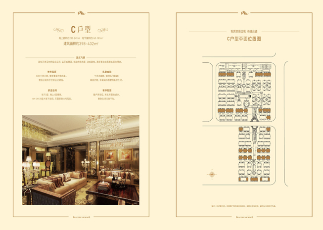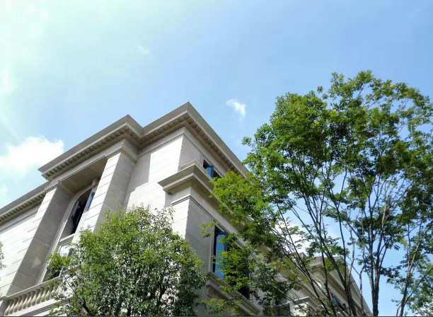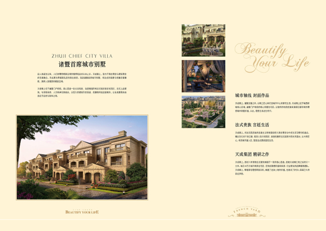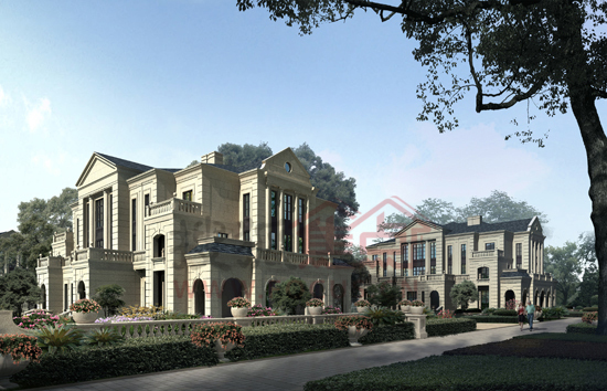 天成锦上的排屋合院都采用最纯正的法式风格建筑。我们以居住的适宜度为主要标准,采用浅色系列,搭配景观设计之后,特别清新高雅。建筑立面以对称严谨的形式设计突出了法式建筑的高贵特征。法式建筑浪漫的孟莎式屋顶,转折精巧的坡度,造型各异的窗子,各种精致的圆拱、券廊、雕花……也都在天成·锦上的设计中充分地加以体现。我们用全真石石材干挂,一方面保证历久弥新的品质,另一方面只有石材干挂才能衬托出法式建筑的华丽高贵。