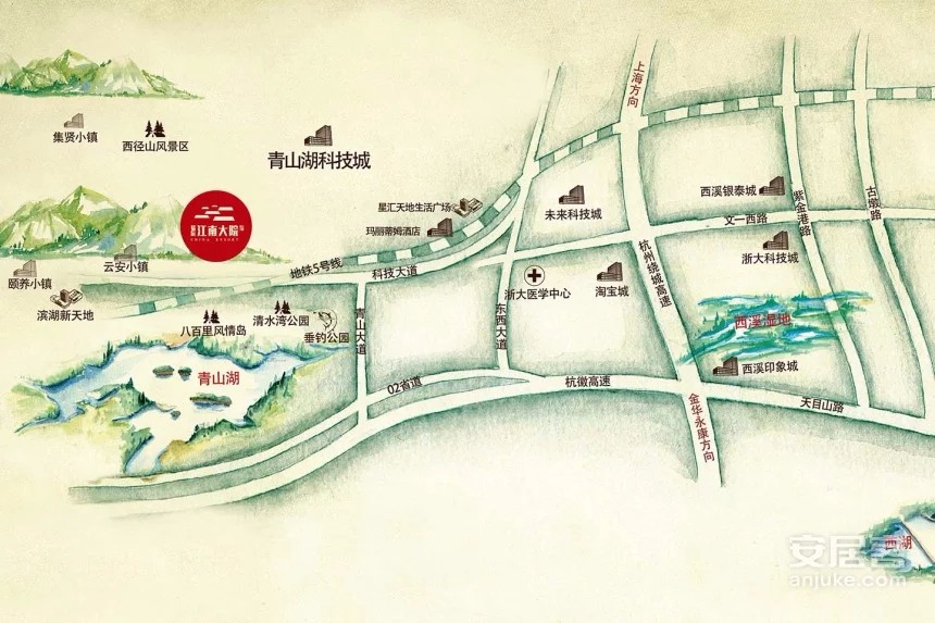| 周边配套: | 周边商业:大型商业综合体、五星级酒店、五星级酒店、图书馆、大剧院、体育馆、游艇码头 周边景观:青山湖、八百里养生园 周边医院:青山人民医院 周边学校:杭州天目外国语学校、浙江农林大学天目学院 周边交通:快速道:文一西路延长线、杭徽高速青山湖出口、02省道。公交线路:规划中地铁轻轨5号线到老余杭延伸段接轻轨至青山湖站、公交598、599线(将开) | ||