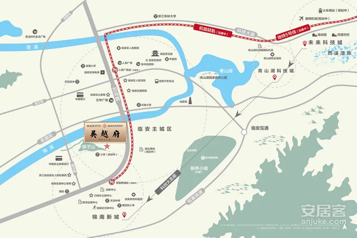 交通周边主干道汇集,北靠02省道,东临城市中轴万马路,可连接杭瑞高速直达杭州市区,出行快捷方便;距离规划杭临城际铁路临安广场站1.4公里,锦南新城站百米之遥。