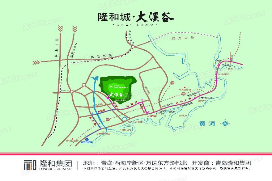 隆和大溪谷位于青岛西海岸新区高山路1997号,地处小珠山南麓,项目是由隆和集团投资13亿元打造的生态化、人性化、低密度高端休闲度假区。项目位于政府大力发展的西海岸经济新区核心位置,紧邻规划中的西海岸CBD。紧邻国家4A级旅游景区——珠山国家森林公园,三面环山,南向面海,自然环境佳。 隆和大溪谷周边有高山路、珠光路、开城路、两河路、滨海大道等主干道路连接西海岸东西城区及青岛市区,更有在建的机场快速路,直通胶州新机场。项目南侧即是备受全球瞩目的万达东方影都,驱车只需5分钟车程,周边诸如西海岸生态观光园、创智产业园、灵山湾影视文化区等众多配套,造就西海岸高端人士聚集地。 隆和大溪谷坐拥博胜苑景区8000亩私属花园以及68亩业主山体公园,三面山峦环抱,有山峰有龙脉,故名大溪谷。景区内200余种花草植被层林叠翠,森林绿化率高达70%以上,空气内的负氧离子高达100000/㎡,是市区的十几倍的含氧量,空气清新有益身心健康。大溪谷的山泉水经专业检测机构检验,富含多种矿物质及偏硅酸,日常饮用有益身体健康,为了提高业主居住品质,隆和集团耗巨资进口水处理设备,使山泉水入院、入户,让业主更加便捷的享受山泉。