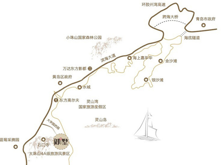 项目位于西海岸经济新区中心区南端的科教片区,项目西侧紧邻国家AAAA级大珠山风景区入口处,与灵山岛隔海相望,至海岸线距离仅有2公里,亲海而不临海,地处山海湖环绕的自然景观区内,拥有绝佳的自然资源。项目到达原胶南主城区青岛主城区都较为便捷,处于“青岛一小时经济圈”之内;海底隧道、滨海大道、跨海大桥、环胶州湾高速,济青高速南北线、国家大环海同三高速等组成了一个四通八达的交通脉络,出行极为便利;一桥一隧实助推了西海岸经济新区的腾飞,到青岛流亭国际机场只需50分钟的时间,胶州新机场的开通会更加方便快捷,这些给御墅提供了便利交通条件;