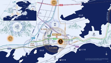 滨海大道、长江路、珠江路三大城市主干道汇流于此;规划中的地铁1号线衡山路站距离项目仅约200米;项目左右排布着前湾港和董家口港两大国际港;同时,沈海高速、青兰高速也在此交汇。
