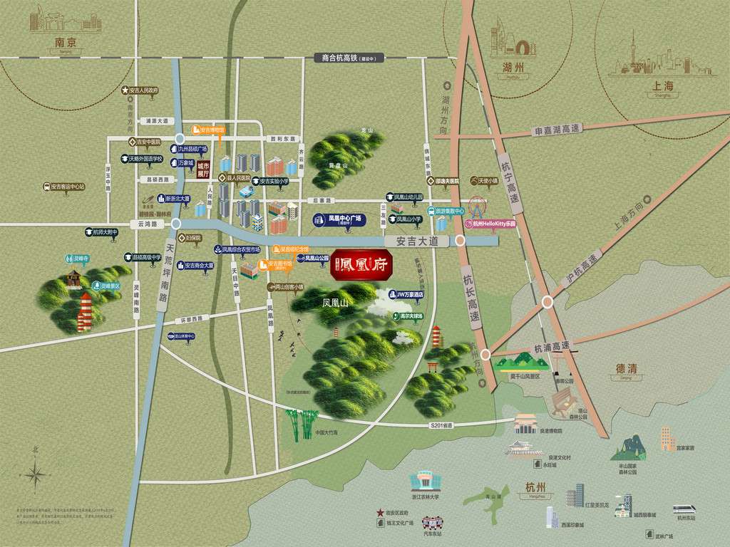 碧桂园凤凰府位居安吉高净值人群集聚的城东别墅住宅区,自然景观、生活配套、学校、交通等醇熟配套汇集于此。项目距杭长高速口仅 1.7 公里,坐享商合杭高铁(建设中)、申嘉湖高速西延等交通利好,无缝对接杭州都市生活圈。出门步行即可直达安吉主城唯一可攀登山体公园——凤凰山公园,拥有150余种植物、负氧离子高达10000个/cm?,是不可复制的原生态资源,成就真正的家门口千亩绿肺。