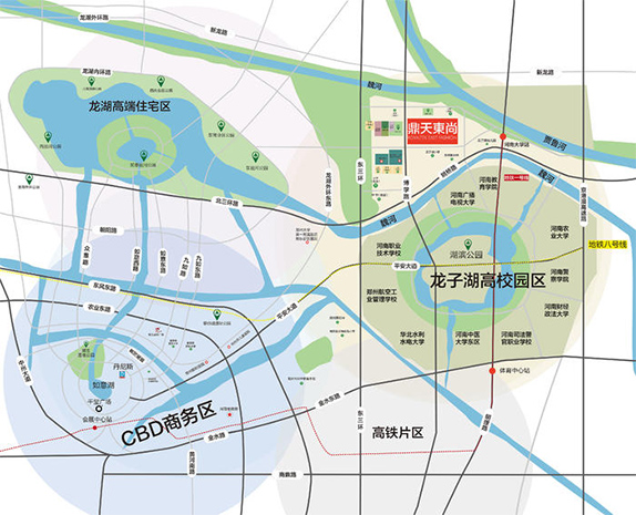 项目位于郑东新区龙子湖片区的核心区域,项目西侧为龙湖副CBD,北侧魏河、贾鲁河双河交汇,南侧为龙子湖大学园区;项目周边生态资源丰富,区域绿化率高达40%,坐拥国家级生态资源。周边拥有三横四纵立体交通网,中州大道、东三环、四港联动大道、京港澳贯穿南北,连霍高速、北三环、金水路横跨东西。项目紧邻地铁1号线、8号线,多条公交线路通达全城。