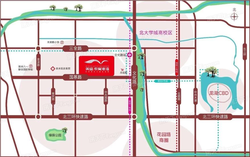 美盛教育港湾项目总占地约1600亩,总建筑面积约550万㎡,24个地块(含教育及拆迁安置地块),涵盖庙李和陈砦地块,后期这里将规划有住宅、商业中心、公寓、酒店等。 A-01地块是首推地块,A-01地块西侧紧邻丰庆北路,南至庙李北路,北至国基路,东至园田北路。总占地面积是约61008平方米(约92亩),总建面约51.2万㎡ (其中地上建筑面积约36.6万㎡,地下总建筑面积14.5万㎡);容积率约5.99,绿地率约25.01%,建筑密度34.99%,配建停车位3553个。该地块由11栋高层住宅(约75-138㎡)和2栋商办公馆组成SOHO(约28㎡)LOFT(约32㎡)。 项目教育资源非常丰富,项目创新融合“房地产+教育”理念,汲取全球人文城市精英,打造以教育培训基地、名校高端住宅、精品公馆、星级酒店、甲级写字楼、多彩社区商业、商业综合体等与一体的全生命周期空间,建设出位于中原的“全球第五大教育城邦”。引进先进的K12教育体系,12年全龄教育营造多空间/多层次教育环境,社区内规划11所幼儿园、5所小学、2所中学等,来将打造成为郑州乃至中原的人文教育大城。项目守着最为成熟的金水区,已经投入使用的有河南省实验幼儿园(分园)、金水区第三幼儿园、文化路第三小学、文化绿城小学、郑州一八联合学校等,一批优质的教育资源。