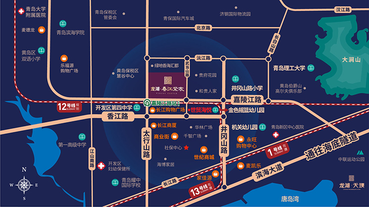 | 周边配套: | 周边商业:香江路利群、金融一条街距离400米,1.5公里维客购物中心,2.4公里长江路商圈,开车十分钟到达唐岛湾商圈