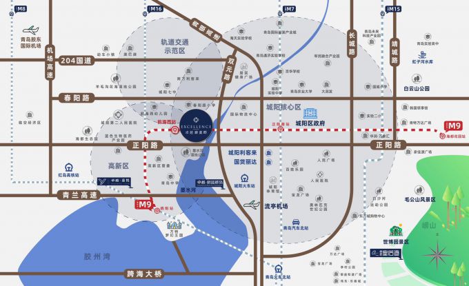 蔚蓝郡地处青岛北部城芯,位于环湾发展的主轴线,北部城市副中心,城阳中心、流亭、棘洪滩、高新区四区交汇位置,区位优势明显。卓越蔚蓝郡距离地铁9号线和24号线交汇站点前海西站仅200米,是正真的地铁盘。蔚蓝郡邻近城阳东西向主干道正阳路和青岛南北主干道双元路,可快速通达青岛各区市,道路交通非常便捷。卓越蔚蓝郡位于城阳西,距离城阳丽达利客来商圈仅3.5公里的距离。 蔚蓝郡一期由7栋27层高层组成,产品为:89平通透三居,全明户型,三南向双阳台设计;100平舒适三居,南北通透,全明双卫设计。